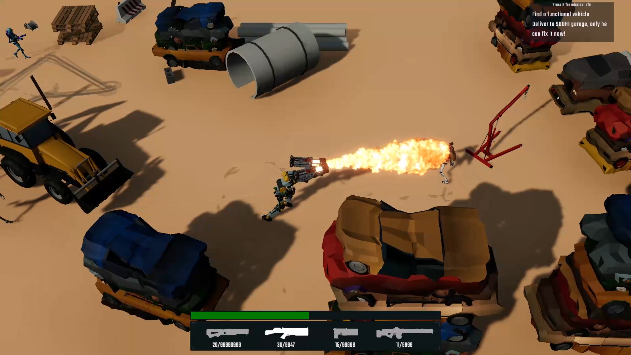 - Melee Enemy: Chase player and dodge bullets, use various scraps and throw axe to slash the enemy